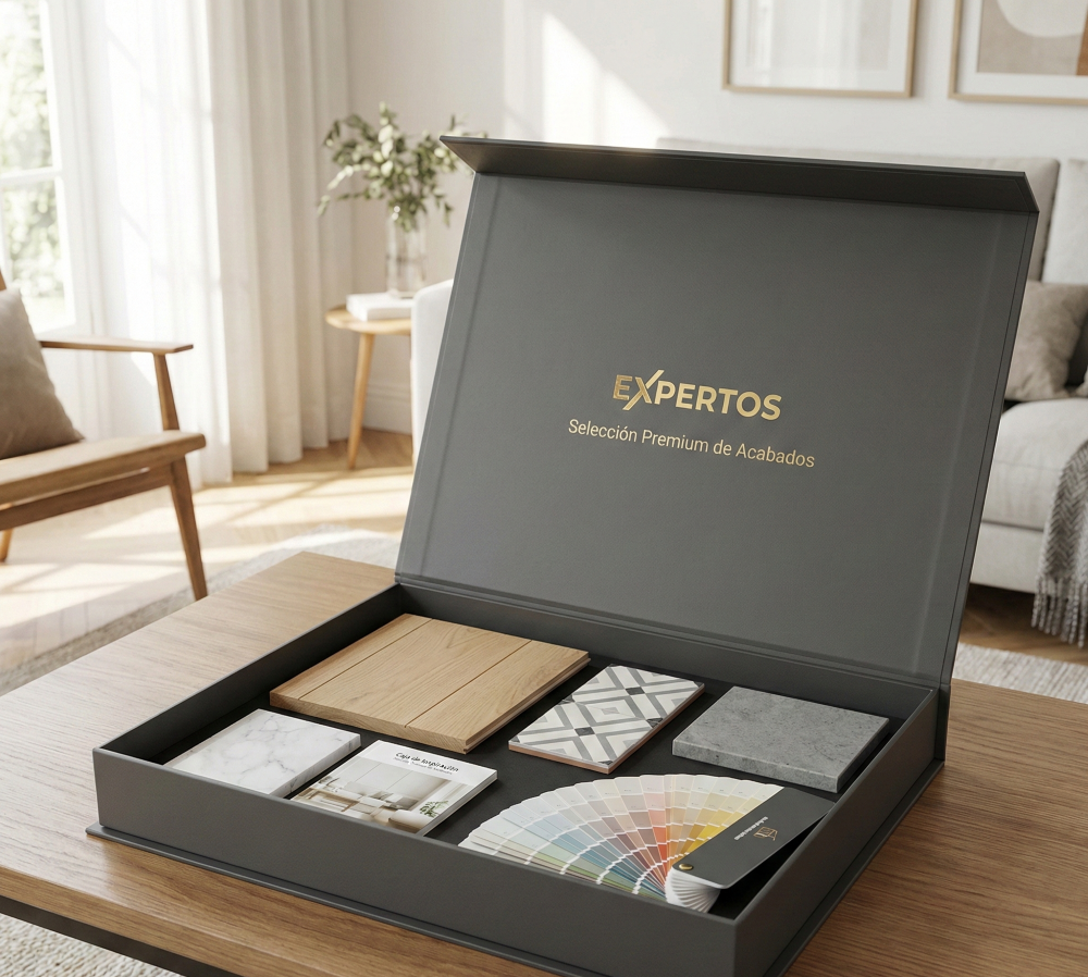 No es lo mismo ver una foto en Pinterest que tocar la textura de una madera noble o sentir el frío de una piedra natural. Esta caja premium te permite experimentar la calidad de los materiales con los que trabajamos sin salir de casa. Contiene una selección cuidada de muestras físicas de pavimentos porcelánicos, fragmentos de encimeras de cuarzo o piedra sinterizada, pequeñas tablas de madera para suelos y cartas de colores de pintura de alta decoración. Incluye un folleto explicativo sobre por qué hemos elegido cada material y cómo combinarlos para lograr un resultado de revista.